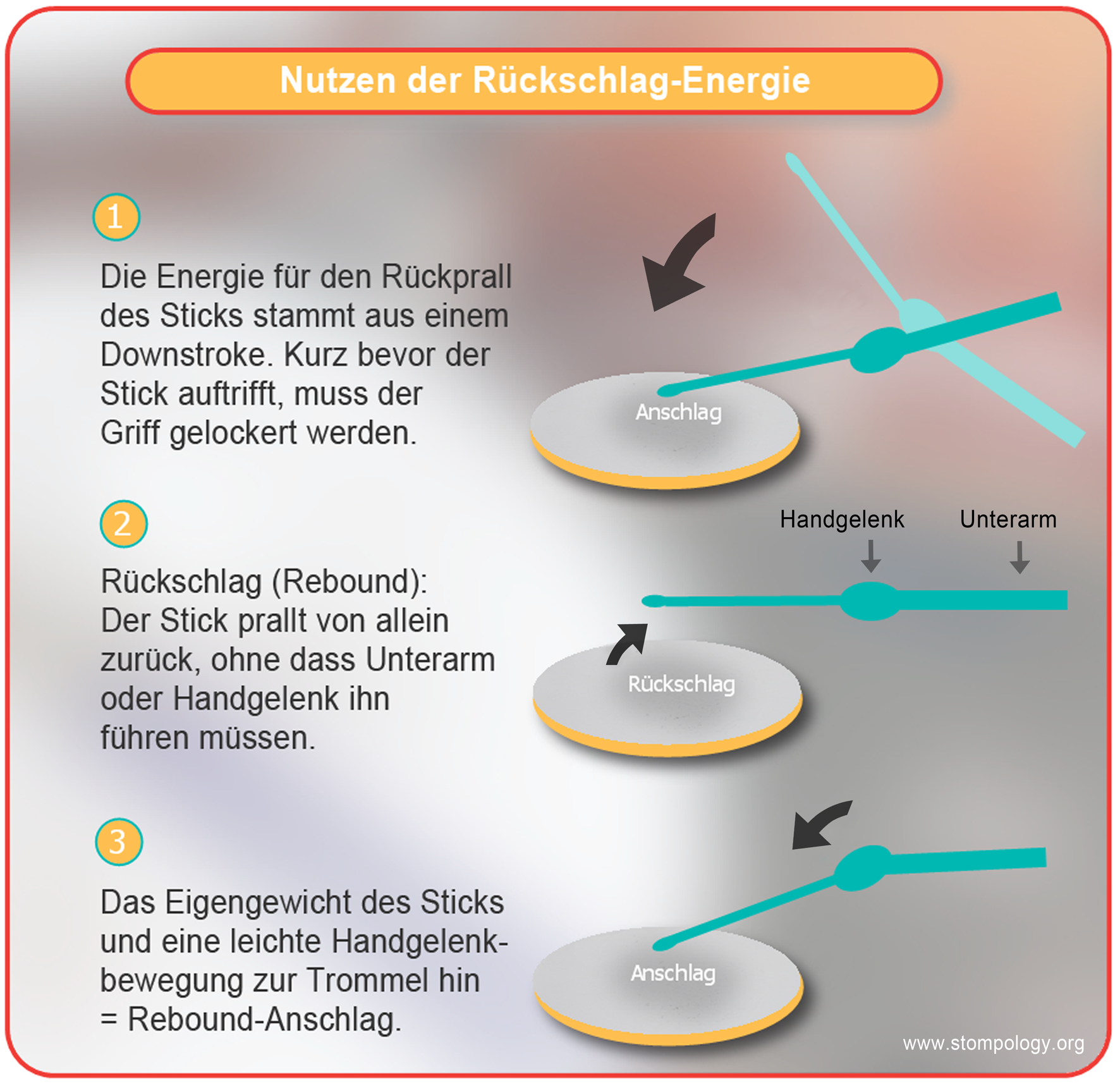 Der Rebound kann für eine Ökonomie der Bewegungen verwendet werden. Je mehr der Rückprall ermöglicht wird, um so weniger müssen Handgelenk und Unterarm die Ausgangshaltung für den folgenden Schlag herstellen. Die Energie aus dem Rückprall „führt“ den Stick nahezu in die Ausgangsposition zurück und das ist bei schnellen Schlagfolgen von großem Vorteil. Und es klingt auch noch gut!