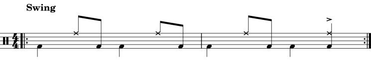 • alle Achtel-Schläge werden in triolischer Dehnung (also im Swing) gespielt.