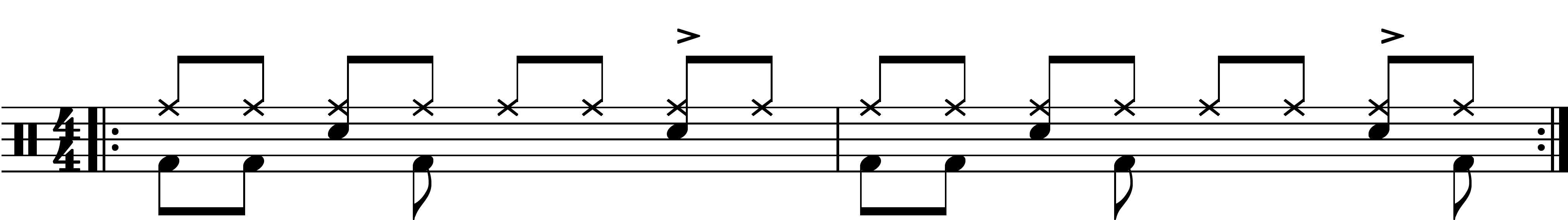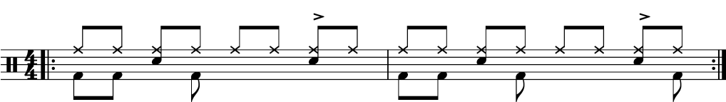 Ausgangspunkt der 4/4 Takte sind Achtelschläge auf dem Ride-Becken und den inzwischen üblichen kräftigen Snare-Backbeats auf der „2“ und der „4“. Also, nichts Aufregendes.
