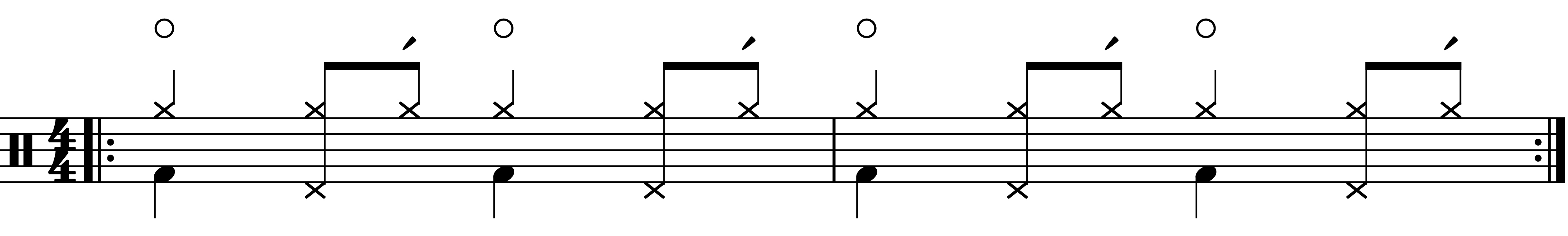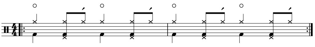 Auf den Beats 1 und 3 ist die Hi-Hat geöffnet, wobei sich Top- und Button-Becken noch leicht berühren. Die Beats 2 und 4 werden mit vollständig geschlossenen Becken gespielt. Auf den „Und-Zeiten“ sind die Becken nur leicht geöffnet.