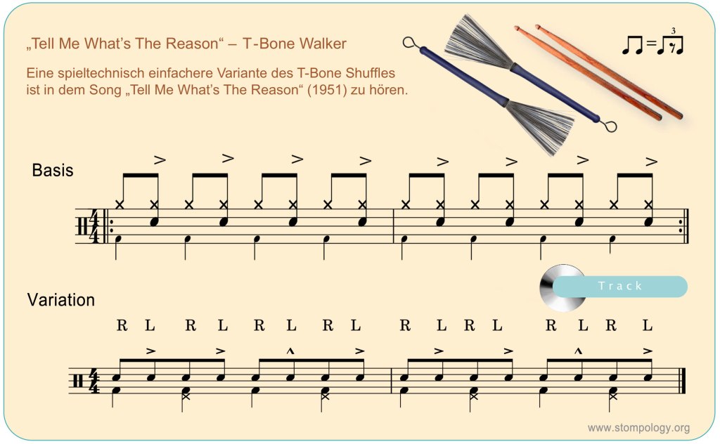 Berühmt (und auch bei Musikern gefürchtet) ist der T-Bone Shuffle von T Bone Walker, weil er in einer dezenten „Gegenrhythmik“ zur gewöhnlichen Shuffle-Figur gespielt wird. Bezeichnet wird diese Spielweise als Back Shuffle oder auch als Stumple Shuffle. Dazu unten mehr.