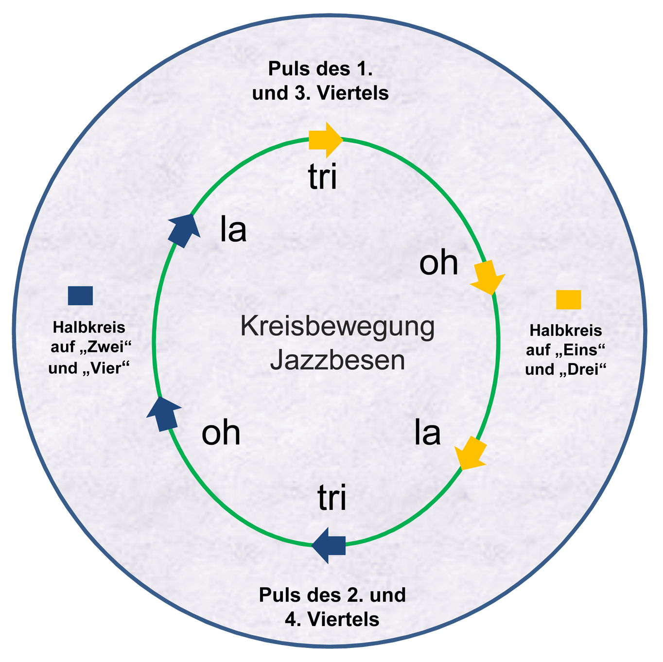 Nicht einfach, weil zunächst sehr ungewohnt, ist die Koordination gleichmäßiger Kreisbewegungen des Besens mit der Shuffle-Schlagfolge im „Gegenrhythmus“ zu der Onbeat-Akzentuierung der Mitmusiker und zur Hörgewohnheit der üblichen Shuffles mit der Betonung auf den Puls-Zählzeiten 2 und 4.