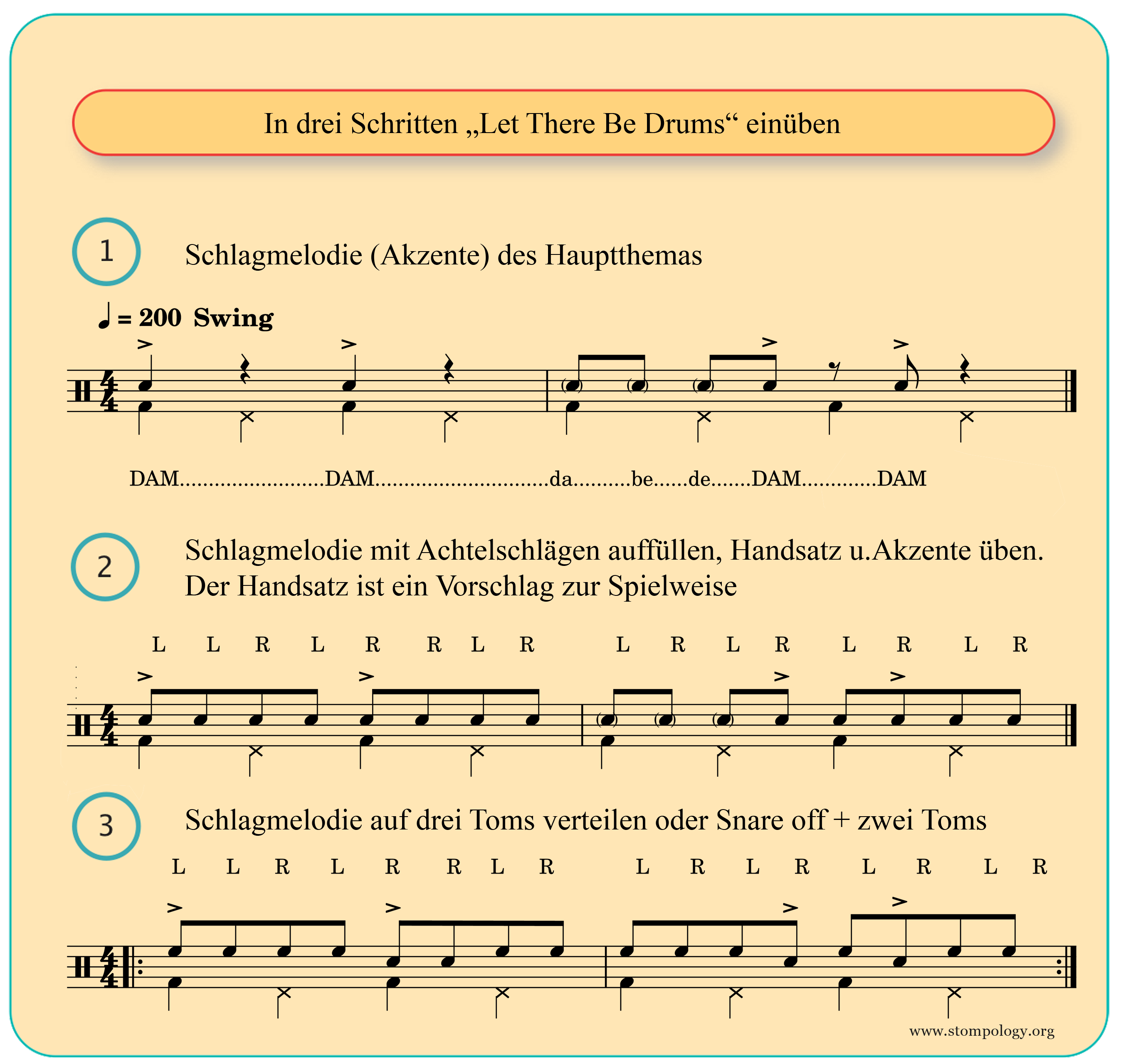 Die Grafik zeigt drei Schritte zum Verstehen und Einüben der Schlagabfolgen. Die notierten Handsätze sind ein Vorschlag. Es ist natürlich auch möglich den Groove mit Achtel-Einzelschlägen oder nur mit Paraddiles zu spielen. Je nach dem, was sich besser anfühlt.