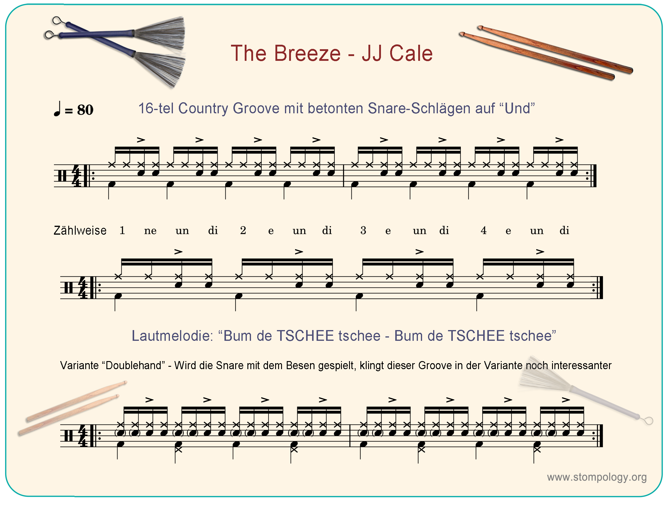 Der Tulsa-Zutaten-Stilmix hat auch in der Rhythmik zahlreicher Kompositionen Spuren hinterlassen. Die dem Blues entlehnten Phrasen werden hörgewohnheitlich als Achtel mit den üblichen Backbeat-Anschlägen auf der Zwei und der Vier wahrgenommen. Der Rhythmus-Gitarre in The Breeze liegen jedoch 16-tel Anschläge und Pausen als Fluss zu Grunde.