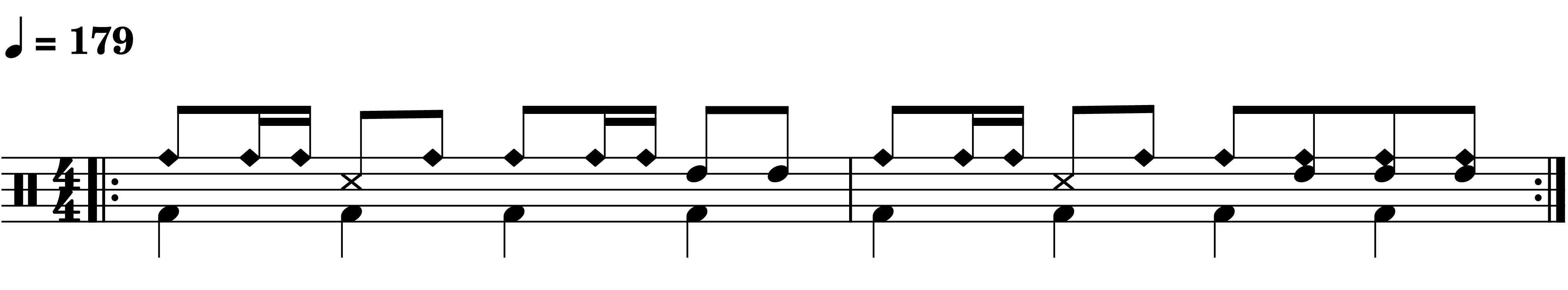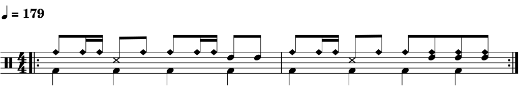 Beim Einüben des Grooves hilft es wie immer zunächst ein langsameres Tempo zu wählen, so dass die Bewegungsabläufe sich nach und nach einprägen. Insbesondere die drei Tom- Anschläge hintereinander im zweiten Takt hakeln vielleicht zunächst etwas.