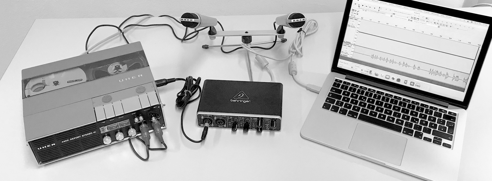 Die Umwandlung der Tonbandaufnahmen in digitale Formate ist hier mit einem Minimum an Technik zu sehen. Das niedrigpreisige Interface von Behringer und die freie Software Audacity reichen für die Erstellung von MP3 Dateien völlig aus.