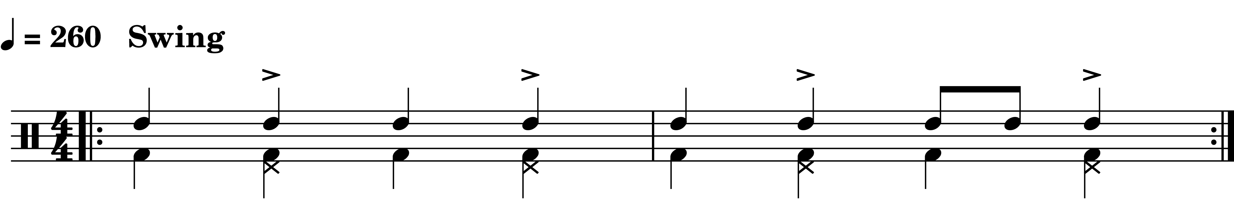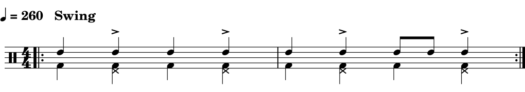 Hier kommt ein Tom-Tom (Jungle-) Groove, der mit Vierteln swingt. Lautsprecher aufdrehen und „hop around the room“!