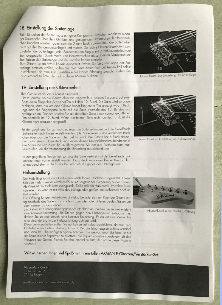 - (1) Wichtig: Dieser Test und Erfahrungsbericht bezieht sich nicht auf akustische Gitarren. Auf Grund ihrer Bauweise bestehen bei den aller meisten Konzert- und Westerngitarren nur eingeschränkte Möglichkeiten der Justierung ohne Hilfe eines Instrumentenbauers. Eine akustische Gitarre für unter 100 Euro, die zum Einstieg geeignet ist, ist dem Autor nicht bekannt.