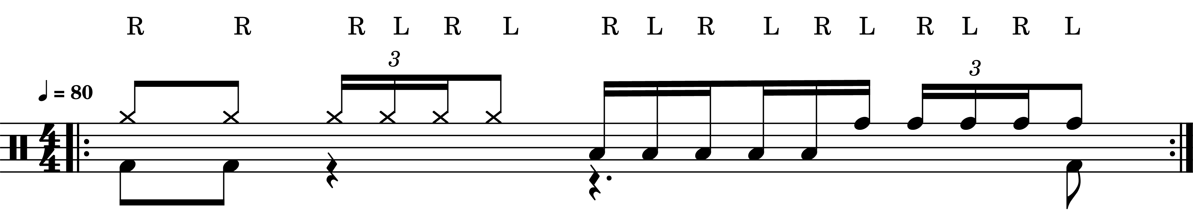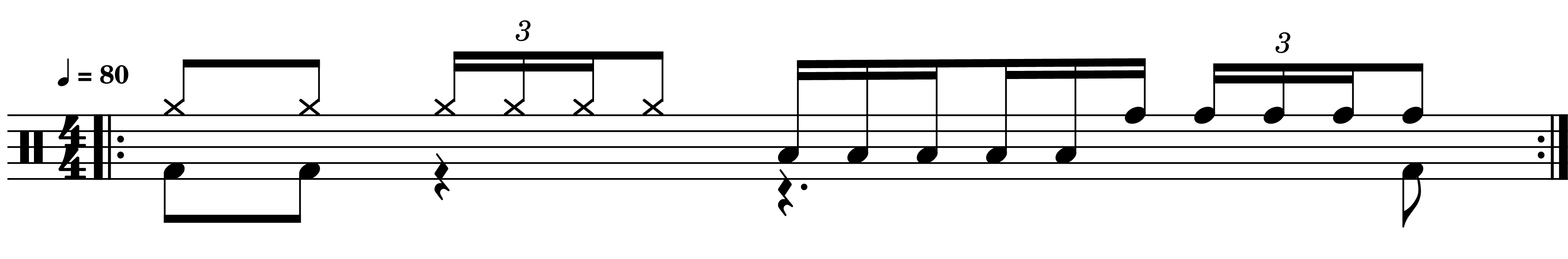 Mit dem zweiten Schritt kann man versuchen die Abfolge auf nur einem Tom synchron mitzuspielen und ein Gefühl für das Triolen-Timing im Zusammenspiel mit der Gitarre und dem Bass zu entwickeln.