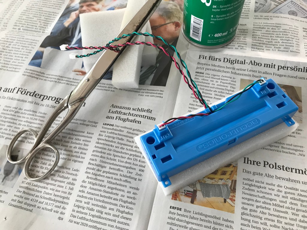 Hallspiralen reagieren schon auf leichte Erschütterungen des Gehäuses. Eine einfache Lösung ist bei kleinen und leichteren Tanks die Einbettung in Schaumstoff. Dieser wird dann im Gehäuse mit den Tanks verklebt.