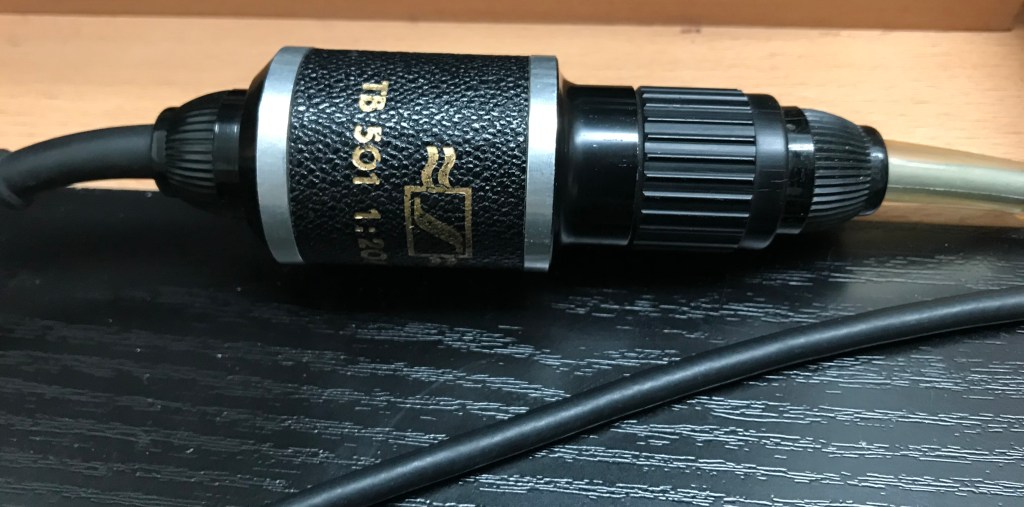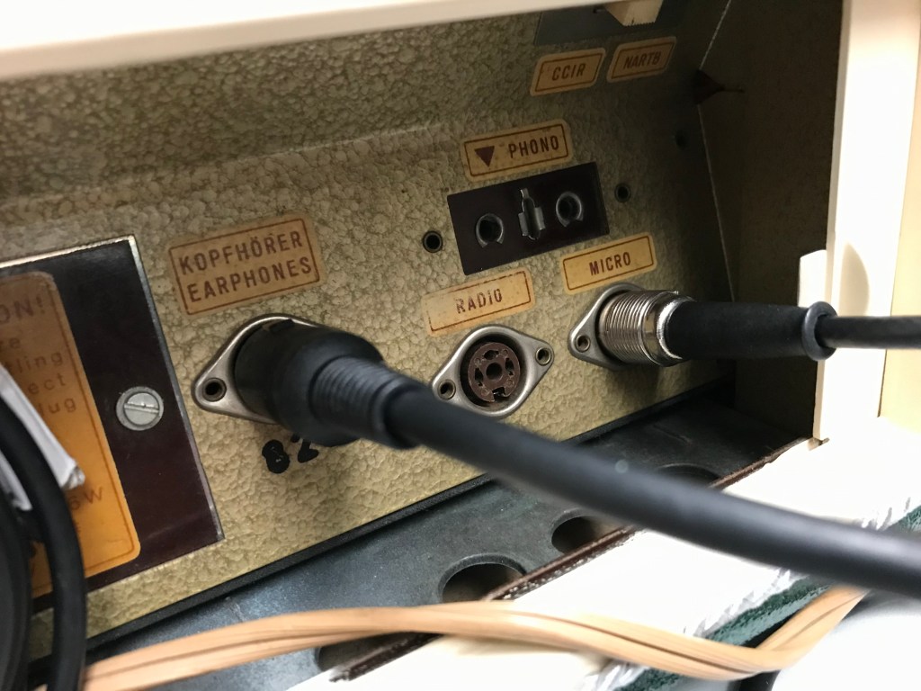 Für den direkten Anschluss eines Mikrofons an das Röhrentonbandgerät wird ein hochohmiges Mikrofon benötigt. Neuere Mikrofone sind meist niederohmig. Abhilfe können hier sogenannte Übertrager schaffen (siehe übernächstes Foto).