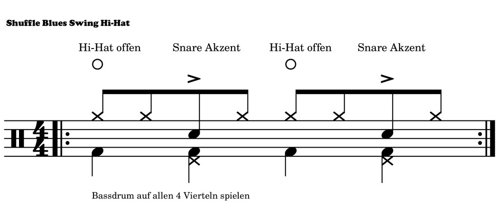 Die Swing Hi-Hat Technik lässt sich nicht nur in die Swing-Schlagfolge (das Swing Pattern) integrieren. Einen vitalen Drive entwickelt die Swing Hi-Hat im moderaten Tempo eines Shuffle Blues. Auch in dieser Variante wird der Back-Beat auf den Becken nicht gespielt.