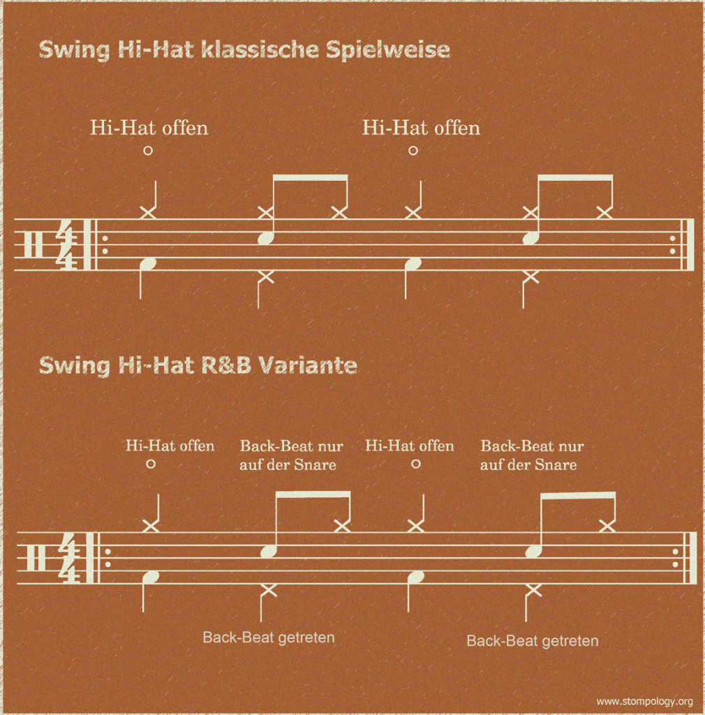 Im Unterschied zur Musikrichtung Swing, wird die Hi-Hat hier „zickiger“ und im Two-Beat Gefühl gespielt.