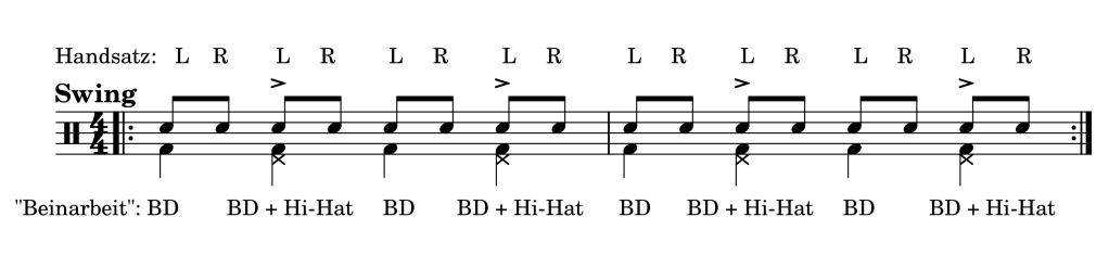 Auch bei der Gewöhnung an das Swing-Gefühl kann eine einfache Übung ohne Drumset helfen. Diese Übung besteht in dem Klatschen der Shuffle-Schläge zum Puls, der mit den Füßen auf der Bassdrum und der Hi-Hat markiert wird. (siehe Übung 1)