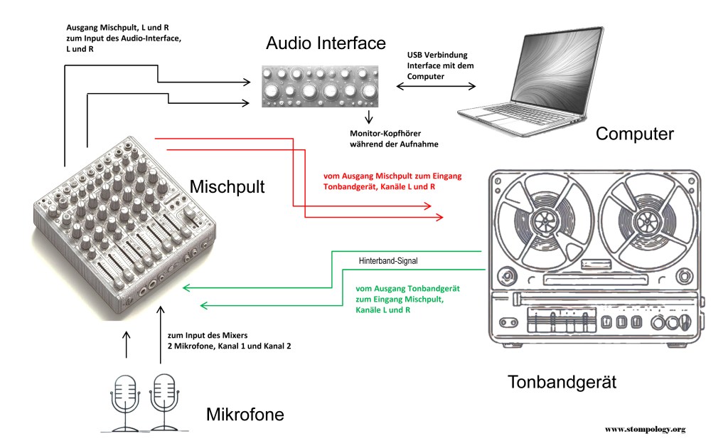 über das Mischpult durch Regelung des Pegels der Beimischung der aufgezeichneten Signale des Tonbandgerätes (in der obigen Grafik ist der Signalweg grün markiert),