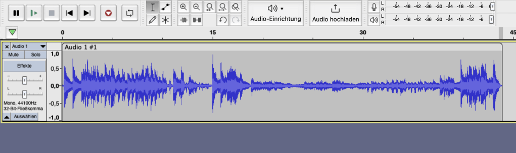 Der Screenshot der Aufnahmesoftware zeigt obiges Audio in seinen komprimierten Signalen. Die Stellen mit wenig Ausschlag wurden extrem leise gespielt. Die am Anfang und am Ende zu sehenden Ausschläge der Akkordwechsel wurden sehr kräftig gespielt.