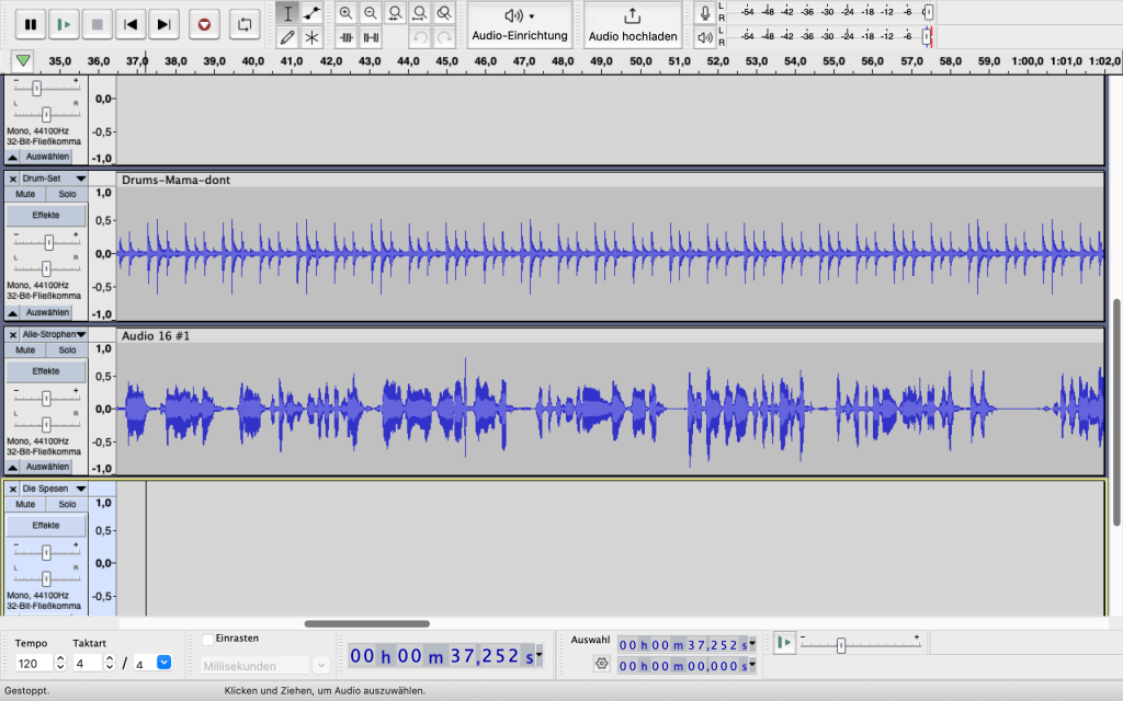 Der Screeshot der Aufnahmesoftware zeigt in der zweiten Spur das Signal einer Gesangsaufnahme. Es wurde die Echocord-Einstellung „Presto“ verwendet. Mit dieser Schaltung läuft das Band recht schnell und dieser Umstand führt zu einer deutlichen Kompression des Signals. Das ist eine gute Sache! Der Gesang setzt sich auch in leiseren Stellen wesentlich deutlicher durch, als das der Fall ohne den Einsatz dieser Technik wäre.