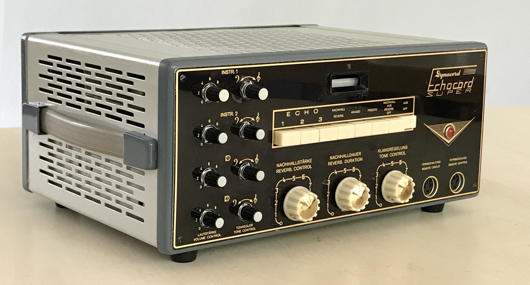 Das Foto zeigt eine Echocord Super65 des Herstellers Dynacord. Das Röhrengerät bietet eine Vielzahl von Einstellmöglichkeiten. Von super kurzen „Rock’n’Roll-Echos“ bis hin zu Echos die mehr in der Psychedelic Music Anwendung fanden. Das hier gezeigte Exemplar wurde vom Voreigentümer mit neueren Knöpfen für die Potenziometer und Klangregelung (linke Seite) versehen. Sehr angenehm ist der „Ein- Ausschalter“ in der Tastenreihe. Bei der Stellung „Aus“ wird die Tonbandandruckrolle vom Antrieb gelöst. Damit kann sich die Gummirolle bei längerer Standzeit nicht verformen.