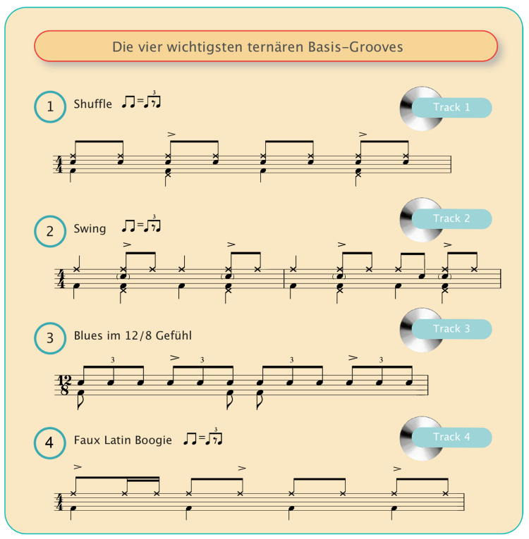 Hörbeispiele zu den vier wichtigen swingenden Basis-Grooves