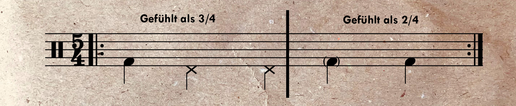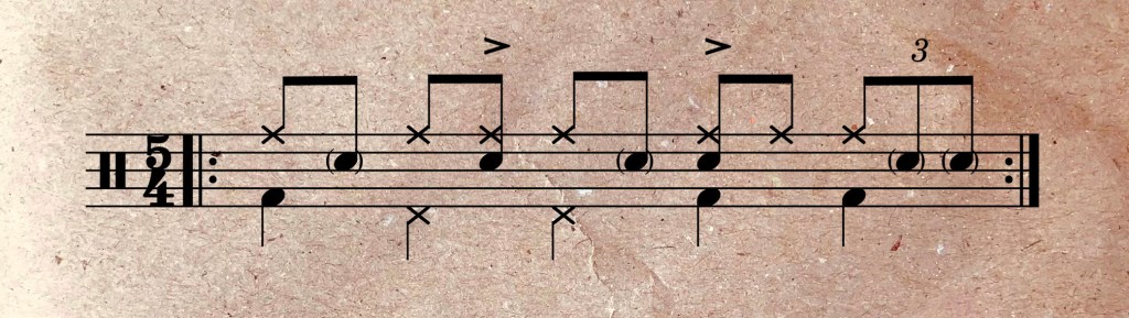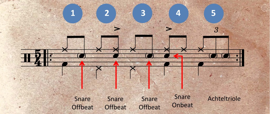 Hilfreich kann es sein, einen 5/4-Takt am Schlagzeug als seine Kombination aus 3/4-Takten und 2/4 Takten aufzufassen. Das kommt dem Take Five Gefühl schon sehr viel näher. Bei der 3/4 + 2/4 Aufteilung stellt sich ein Spielgefühl ein, dass schon mit den Grundschlägen zum swingen einläd.
