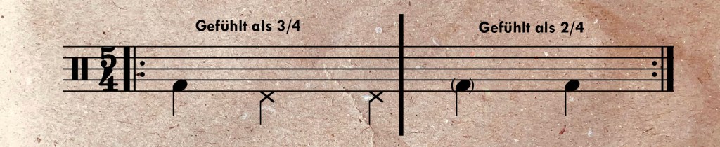 Damit lässt sich jedoch der Drive des Take Five Grooves nicht so ohne Weiteres nachempfinden. Die „Fünf“ klingt als „angehängter“ Schlag wie das „fünfte Rad am Wagen“ und wirkt ein wenig unorganisch im Fluss. Mehr dem Charakter der Komposition entspricht es, in einer 3/4 und 2/4 Aufteilung zu fühlen und zu spielen.