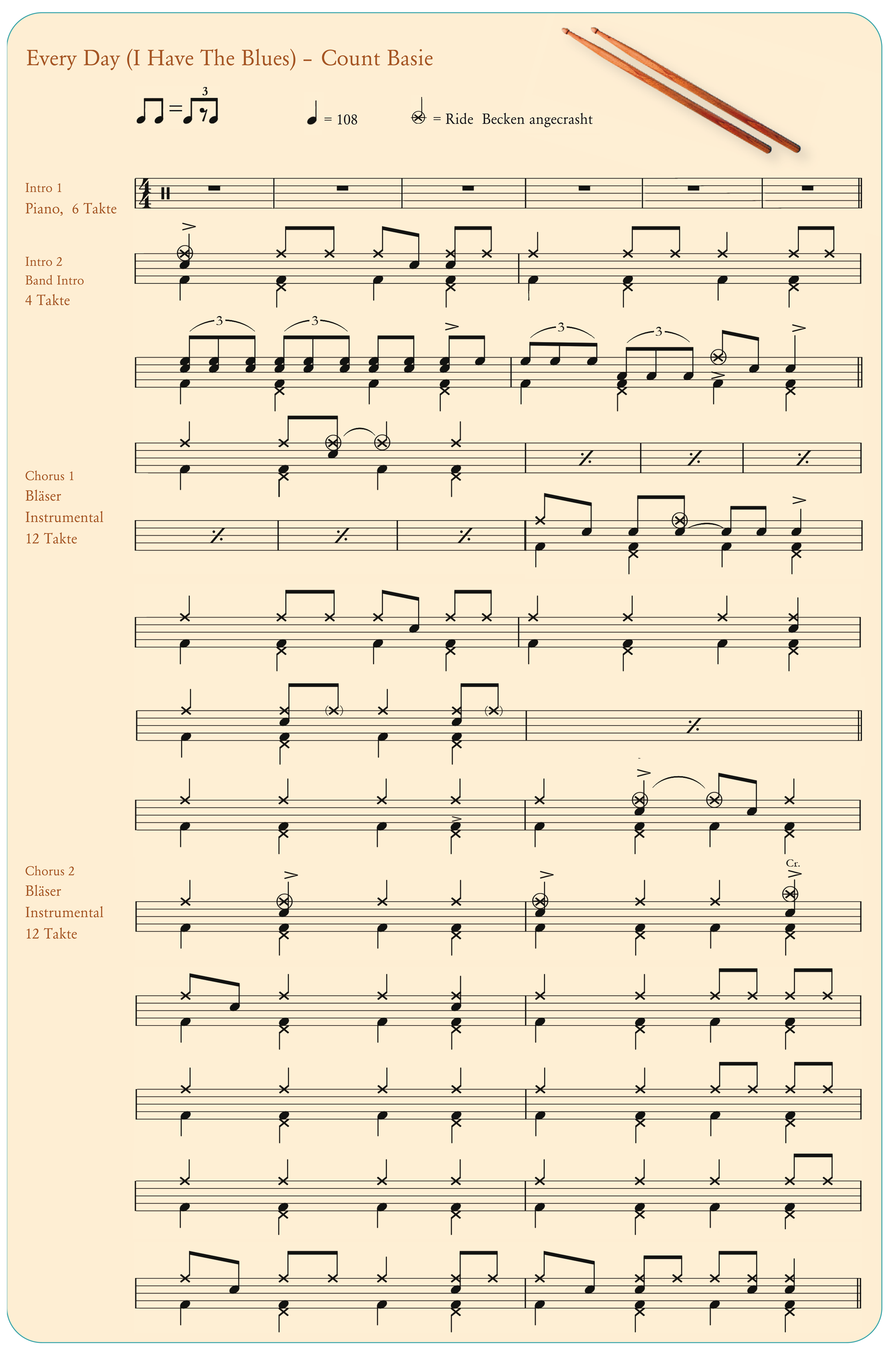 Ein kurzes Schlagzeugsolo als Intro, bestehend aus Achteltriolen in einer Einzelschlag- und Pressroll-Kombination auf der Snare sorgt für einen mitreißenden Einstieg in den Song. Ursprünglich hervorgegangen aus der Militärmusik, dem sogenannten Lockmarsch (der „Locke“) wurde diese Technik im frühen New Orleans Jazz dem „triolischen Feel“ angepasst und später von Buddy Rich und Gene Krupa mit den raffiniertesten Akzentverschiebungen zu einem der spektakulären Markenzeichen des hochentwickelten Bigband Drumming der 30er und 40er Jahre (siehe Notenzeile drei und vier in der Abbildung).