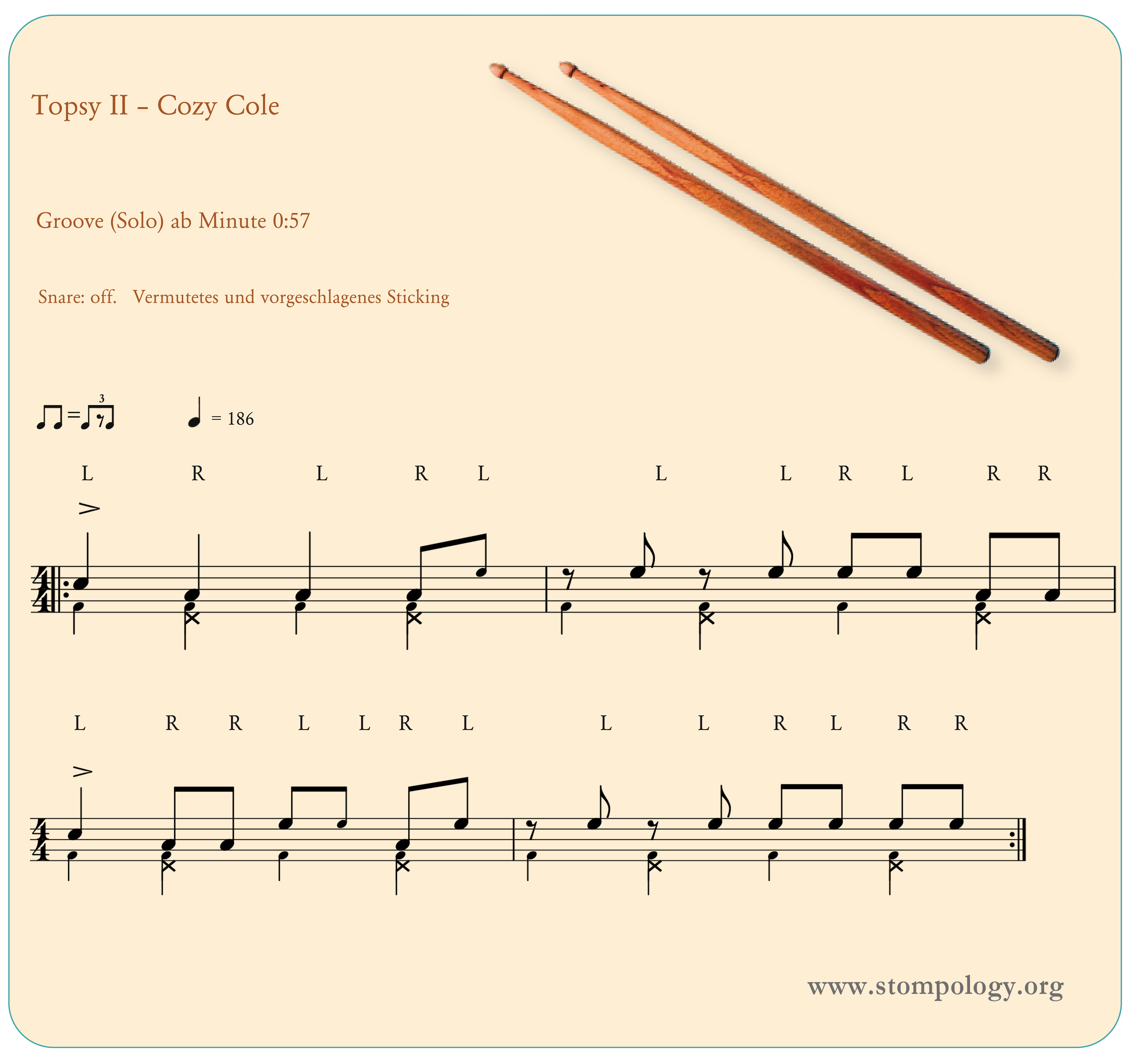 Die Swing Hi-Hat des ursprünglichen Benny Goodman Hits aus dem Jahre 1938 ersetzte Cole durch eine melodiöse Jungle Groove Figur, die er im Laufe des Songs zu einem längeren Solo ausbaut. Die Basis dafür bilden die vier Takte, die nachstehend abgebildet sind und bereits im Intro von „Topsy 2“ gespielt werden. Auf den Zählzeiten „Zwei“ und „Vier“ ist im Solo, zusätzlich zur getretenen Hi-Hat, ein Schellenkranz zu hören. Charakteristisch für Coles Solokomposition ist die Hervorhebung der Zählzeit „Eins“.