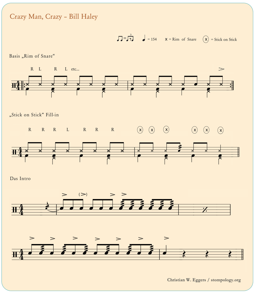 Der nachstehend gezeigte Groove (Basis „Rim of Snare“ in der ersten Notenzeile der Abbildung) mit der Refrainzeile „Crazy Man, Crazy“ setzt ab dem neunten Takt ein. Es handelt sich um einen in zwei Takte unterteilten Shuffle, der synchron zum Slap-Kontrabass die Achtel auf dem Spannreifen (Rim) der Snare „Hand to Hand“ klickern lässt.